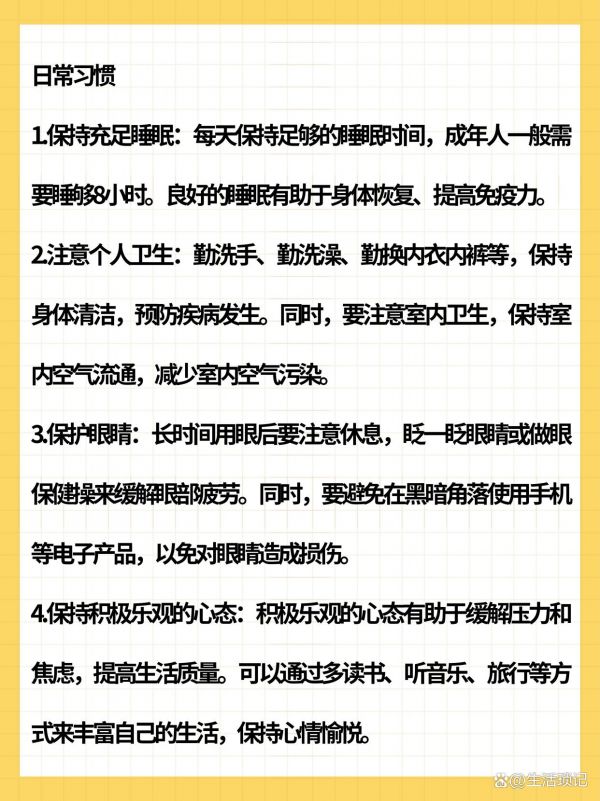 1.保持充足睡眠:每天保持足够的睡眠时间,成年人一般需要睡够8小时。良好的睡眠有助于身体恢复、提高免疫力。