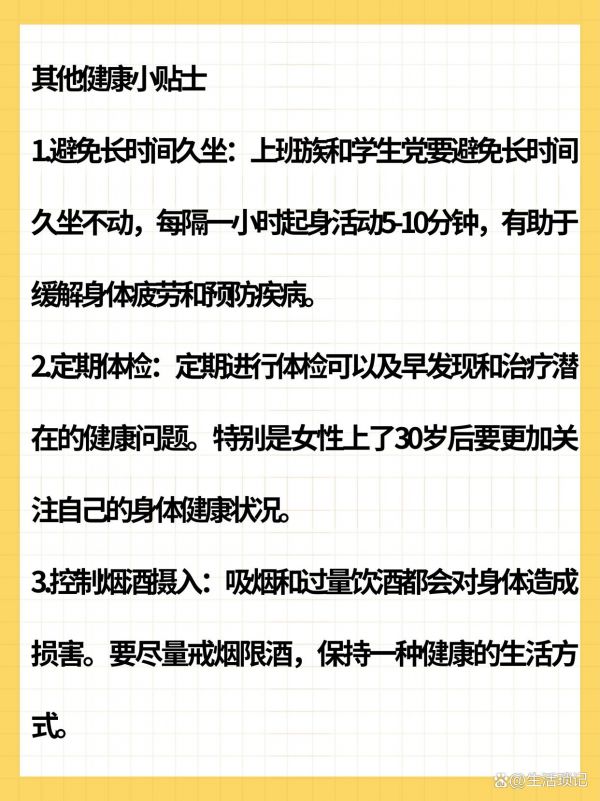 1.避免长时间久坐:上班族和学生党要避免长时间久坐不动,每隔一小时起身活动5-10分钟,有助于缓解身体疲劳和预防疾病。