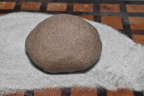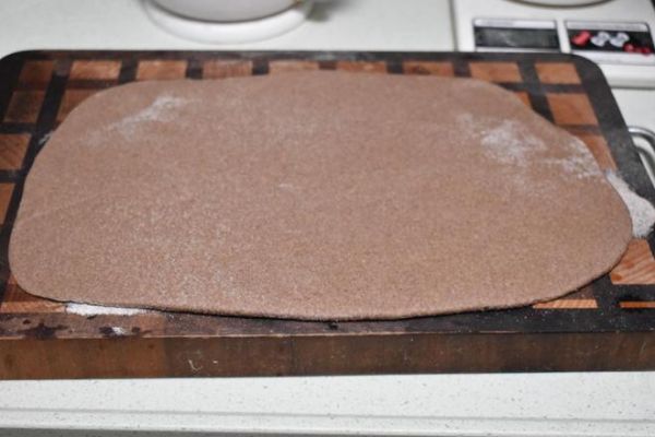 第三步 黑全麦面粉揉成光滑面团,用保鲜膜覆盖着,松弛15分钟。操作桌面要撒上干面粉,黑全麦面粉擀成长方形面片。