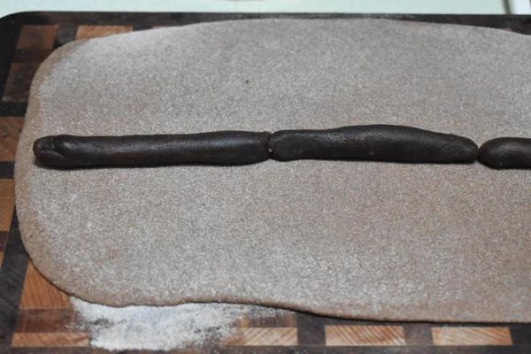 第四步 把红豆沙搓成长条形,把红豆沙放在面团中间。