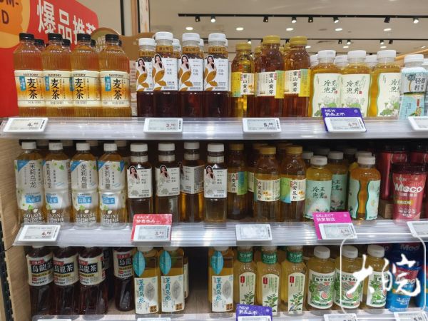 在合肥各大超市的饮料区,纯茶饮品“存在感”十足。在盒马鲜生,大皖新闻记者注意到,除了常规的“茶饮料”专区,品牌还特别设置圆形货架陈列自营特色纯茶。“最近多了很多新的茶饮,看起来都很养生,买的人也不少。”工作人员介绍道。