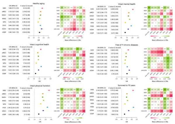 结果显示,105432 名参与者中,只有 9771 名参与者(占总人数的 9.3%)实现了健康老龄化。坚持这 8 种饮食模式中的任何一种,都与整体健康老龄化及其各个领域(包括认知、身体和心理健康)有关。