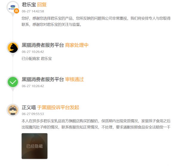 6月27日,网友在投诉平台 【下载黑猫投诉客户端】发起对君乐宝的投诉。据投诉内容显示,网友在拼多多君乐宝乳品官方旗舰店购买的酸奶,在保质期内出现变质情况,家中孩子食用后疑似出现腹泻、肚子疼症状。网友联系客服反馈,却被告知是正常情况,不予处理。于是网友发起投诉,提出要求道歉并要求按照《食品安全法》赔偿一千元的诉求。
