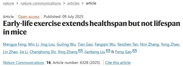 近期康复大学/西安交通大学刘健康教授团队和空军军医大学高峰/张星教授团队共同在Nature Communications发表了题为“Early-life exercise extends healthspan but not lifespan in mice”的研究论文,该研究旨在探讨生命早期运动对小鼠寿命和整体健康状态的远期效应。研究人员发现生命早期3个月(小鼠1-4月龄,相当于人类青少年期(5-20岁))的中等强度运动,并不能延寿,但显著延长了小鼠的健康寿命(healthspan)0.2-0.5年,主要表现为:显著改善老年期的代谢、心血管和肌肉功能,并降低全身炎症与衰弱风险。这一保护效应在停止运动后仍持续至晚年,且雌雄小鼠均受益。