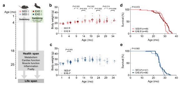 为了探究早期运动对寿命的影响,研究人员从1月龄至3月龄让运动组的小鼠持续进行中等强度的游泳训练,此后所有的小鼠都自然饲养不进行任何干预,直至小鼠“寿终正寝”。该研究纳入了几百只雌性和雄性的小鼠,仅就饲养小鼠到自然死亡的实验就进行了超过三年。结果并不是想象或预期的“长寿”,统计学结果显示早期运动雌雄小鼠的整体寿命并未得到延长。