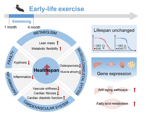 虽然生命早期运动没有提升所有小鼠的生存率,但早期运动显著改善了衰老小鼠的“健康寿命”。早期运动改善了小鼠衰老期的瘦体重和胰岛素敏感度,改善了衰老期心脏舒张功能和血管功能,延缓了衰老小鼠脊柱弯曲和肌肉力量及功能的下降,减轻了炎症因子的水平和衰弱的表征。当以国际最新量化健康寿命的指数FAMY和GRAIL计算时,早期运动延长了0.2-0.5年小鼠的健康寿命。