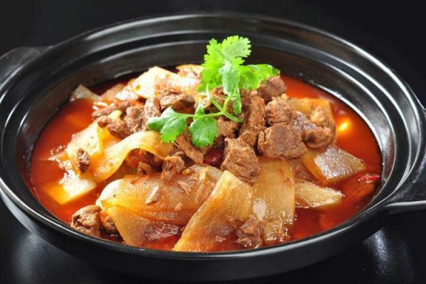 牛肉烧萝卜(106g)、酸辣粉(18g)、炒莲白(106g)、冬瓜汤(70g)。