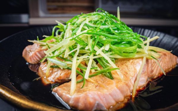 蒸三文鱼(130g)、凉拌黄瓜(120g)、丝瓜汤(70g)。