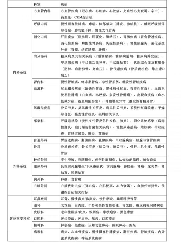 心血管内科: 心血管疾病(冠心病、心脏病、心绞痛、充血性心力衰竭、卒中)、高血压、CKM综合征 呼吸内科: 慢性阻塞性肺病、哮喘、肺部感染(肺炎、肺结核)、睡眠呼吸暂停综合症、肺功能下降、慢性支气管炎 消化内科: 肝胆疾病(脂肪肝、肝硬化、胆结石)、胃肠疾病(胃食管返流病、消化性溃疡)、功能性胃肠病、炎症性肠病、慢性胰腺炎、消化系统肿瘤(胃癌、结直肠癌、肝癌) 内分泌科: 糖尿病及其相关疾病(2型糖尿病、糖尿病前期、糖尿病并发症)、甲状腺疾病(甲状腺功能异常、甲状腺癌)、代谢综合征及其组分(肥胖、血脂异常、高血压)、骨代谢疾病(骨质疏松症、维生素D缺乏) 肾内科: 慢性肾脏病、终末期肾病、急性肾损伤、继发性肾脏疾病 血液科: 贫血相关疾病(缺铁性贫血、慢性病性贫血、营养性贫血)、血液系统恶性肿瘤(白血病、淋巴瘤、多发性骨髓瘤)、出血性疾病(血小板减少症、凝血功能异常)、骨髓增生异常(继发性骨髓病) 风湿免疫科: 关节炎、类风湿性关节炎、系统性炎症疾病、系统性红斑狼疮、干燥综合征、强直性脊柱炎、免疫相关炎症疾病 感染科: 慢性乙型肝炎、丙型肝炎、结核病、HIV感染、寄生虫病、梅毒、肝脏寄生虫病、肠道感染、肝炎、艾滋病 外科系统