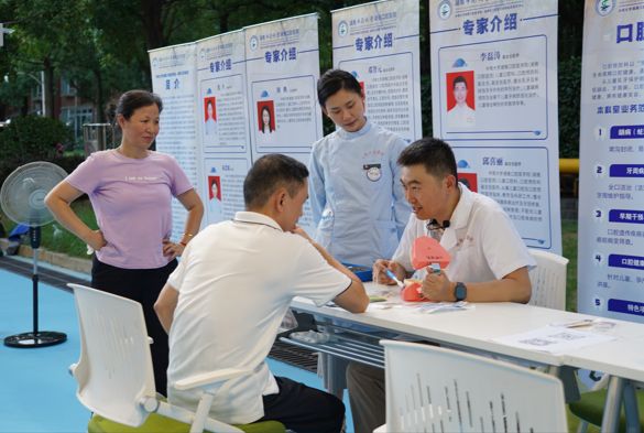 比赛之余,口腔预防科和“球星”专家组成的湘雅口腔健康宣教团为前来义诊咨询的群众提供了口腔筛查和健康宣教。口腔预防科副主任、宣教团团长李磊涛医生带领科室医护,仔细询问大家的日常饮食习惯、牙齿清洁情况,针对部分有口腔疾病的群众给出指导性建议和意见,还现场演示了巴氏刷牙法、牙线使用等技巧。