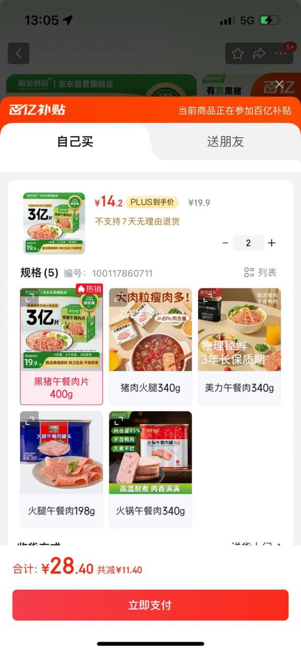 网址: 高金食品儿童黑猪午餐肉400g 早餐火锅食材 0添加 小包装 火腿肠,28.4元(合14.2元/件)—— 慢慢买比价网 https://www.trfsz.com/newsview1616656.html