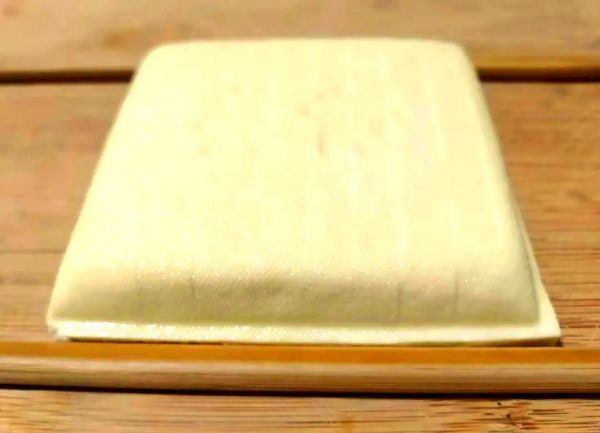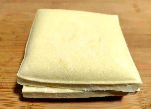 豆干需经过清洗和切割处理,使用筷子辅助切刀,注意切至厚度的三分之二处。首先,将白豆干彻底清洗干净。