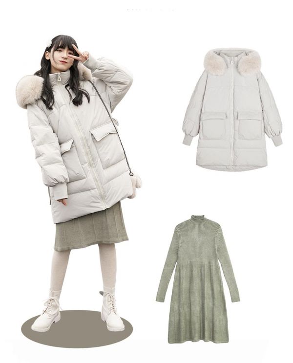 不会选内搭很烦恼?一袭墨绿色连衣裙,就可以直接解决你的烦恼。而且针织连衣裙还很保暖,相当于穿了一件毛衣,白色马丁靴一上线,霸气潇洒感是挡不住了,不经意的美才显高级!到了室外,快披上白色棉服,可爱还不显臃肿。
