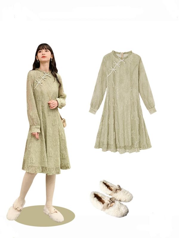 墨绿色的连衣裙,细节处加入了刺绣的设计,很有古代的淑女气息,小家碧玉大概就是这样子来的吧!和毛毛鞋是最配的,不经意的美才显高级!挡不住你的软萌感。