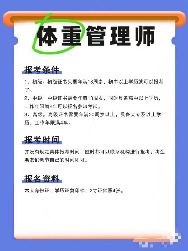 健康状况:报考者需身体健康,无传染性疾病。这是基于体重管理行业对从业者身体素质的要求,确保从业者能够为客户提供安全、有效的体重管理服务。
