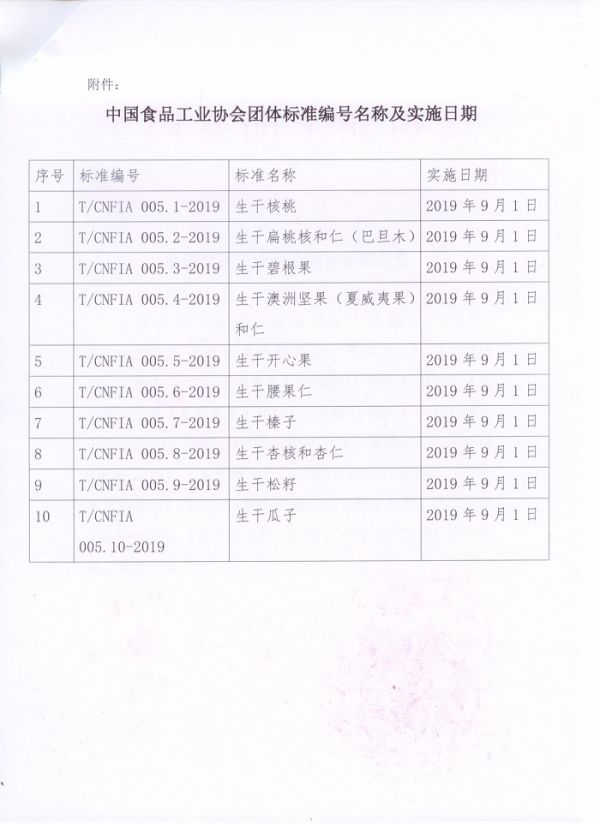 由中国食品工业协会协会组织起草制订的《坚果籽类食品质量等级》系列团体标准(T/CNFIA 005—2019),共10个产品,经中国食品工业协会批准于近期发布,并定于2019年9月1日实施。