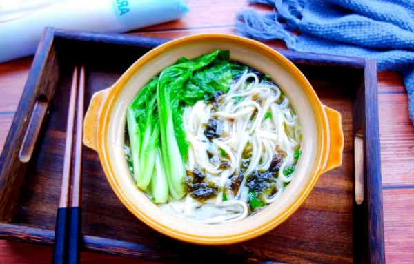 以紫菜、小白菜为主料,突出自然鲜味,搭配简单的调料与香油,清爽宜人。将煮好的面条与加入微量调料的紫菜和小白菜混合,成就了一碗鲜美的清汤挂面。