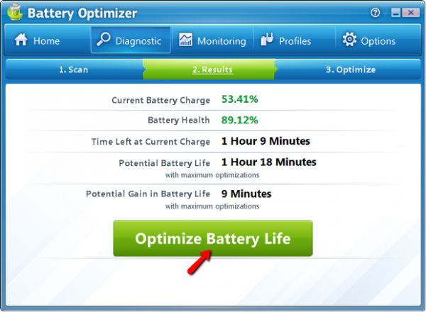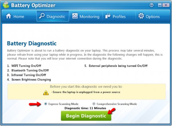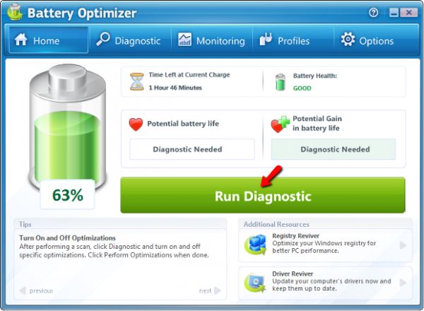 1.在Battery Optimizer的主屏幕上,单击“运行诊断”按钮以开始使用: