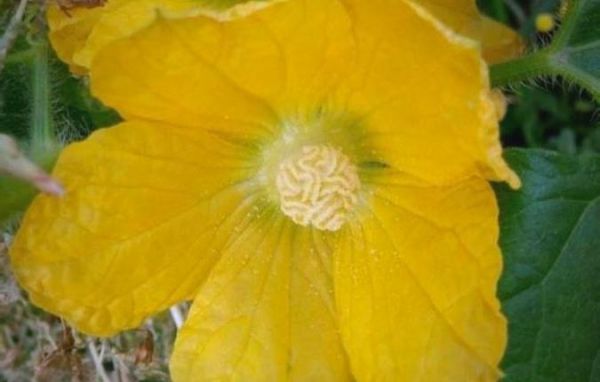 花单性,雌雄同体;单花着生于叶腋,其花梗覆盖着硬毛;花萼管状,裂片呈三角卵形,边缘带有锯齿,可反折;花冠黄色,基部5裂,形态外展;雄花拥有3根雄蕊,花丝分离,花药为卵形,其药室S形曲折;而雌花的子房则呈现长圆筒形或长卵形,密被黄褐色长硬毛,柱头3个,略带扭曲。