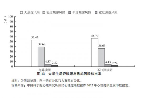 报告指出,有50.44%的大学生打算读研。打算读研学生的焦虑风险显著高于没有读研打算的学生。尽管适度的焦虑情绪有利于备考和学习,但是如果备考学生存在过度焦虑的情况,需及时干预。