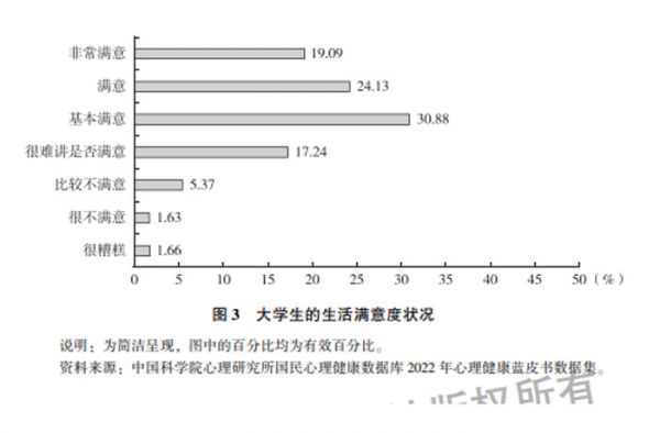 中国科学院心理研究所、社会科学文献出版社联合发布了我国第三本心理健康蓝皮书,书中报告了《2022年大学生心理健康状况调查报告》,调查结果显示:大学生总体心理健康状况良好,但应该加强对大学生的生活方式、生涯规划和恋爱心理健康教育的关注。