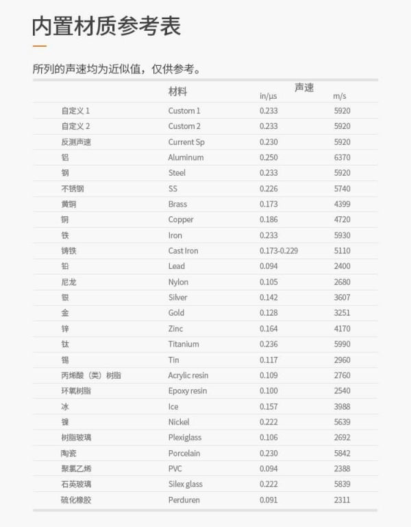以下为超声波测厚材料声速对照表,所列声速均为近似值,仅供参考。