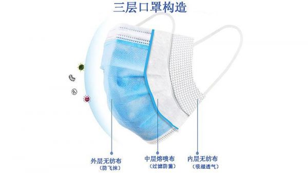 口罩通常是由熔喷布、无纺布、口罩带、鼻梁筋组成。口罩内外两层层均采用无纺布材料,中层采用熔喷布,这个部分也被成为口罩的过滤层。口罩的最外层主要用于防止飞沫,中间层则是能过滤飞沫、粉尘颗粒或细菌的核心层,内层主要用于吸湿。