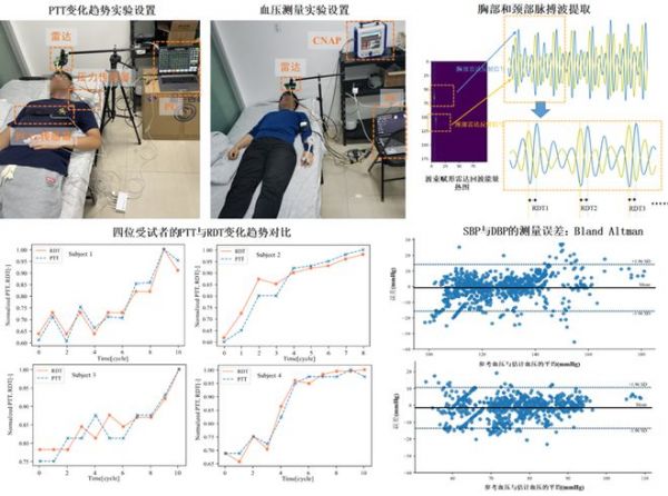 科研团队首次提出并研制了基于脉搏波传递时间的单雷达非接触式连续血压测量系统,利用单毫米波雷达实现血液从心脏左心室到颈动脉传递时间的实时测量。该系统所测脉搏传递时间与穿戴式测量的传输时间相关系数可达0.91,其收缩压(SBP)和舒张压(DBP)误差分别为5.54±7.62 mmHg和4.68±6.15 mmHg(图2),接近于美国医疗器械促进协会颁布的评价电子血压计的国际标准(AAMI)标准,因此有望在不干扰用户日常活动的情况下以非接触的方式连续测量血压。