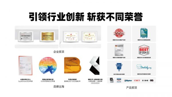 在渠道建设方面,Oclean欧可林已与正夫口腔、护芽口腔等知名连锁口腔机构建立深度合作,产品获得专业医疗渠道的广泛认可。国际市场上,Oclean欧可林更是屡获殊荣,先后斩获2023 年德国《最受喜爱产品奖》,2024葡萄牙《消费者最喜爱电动牙刷》、美国CES 2024最佳产品奖、 Tech Advisor (国际科技产品评选极具威信力与影响力媒体)2024-2025 年度最具创新电动牙刷奖、2025 年 T3 (国际TOP3 科技媒体)的最佳电动牙刷奖,以及产品德国红点设计、iF设计奖等诸多国际设计奖项,更获得波兰牙医协会官方推荐。