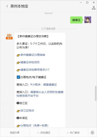 温馨提示:微信搜索公众号【泉州本地宝】,关注后在对话框中回复【健康证】可获泉州电子健康证申请入口/流程、办理网点查询入口(免费/收费)、免费条件/体检要求/取证时间等信息。