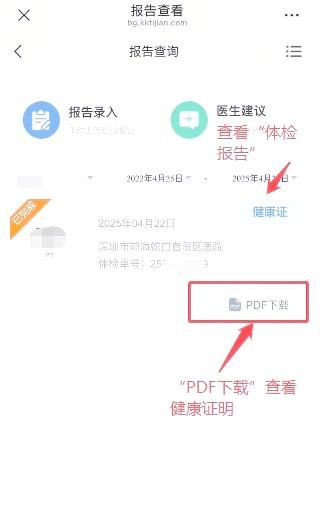 在“报告查看”页面,点击“PDF下载”按钮,即可打开下载的PDF版电子健康证明文件进行查看。