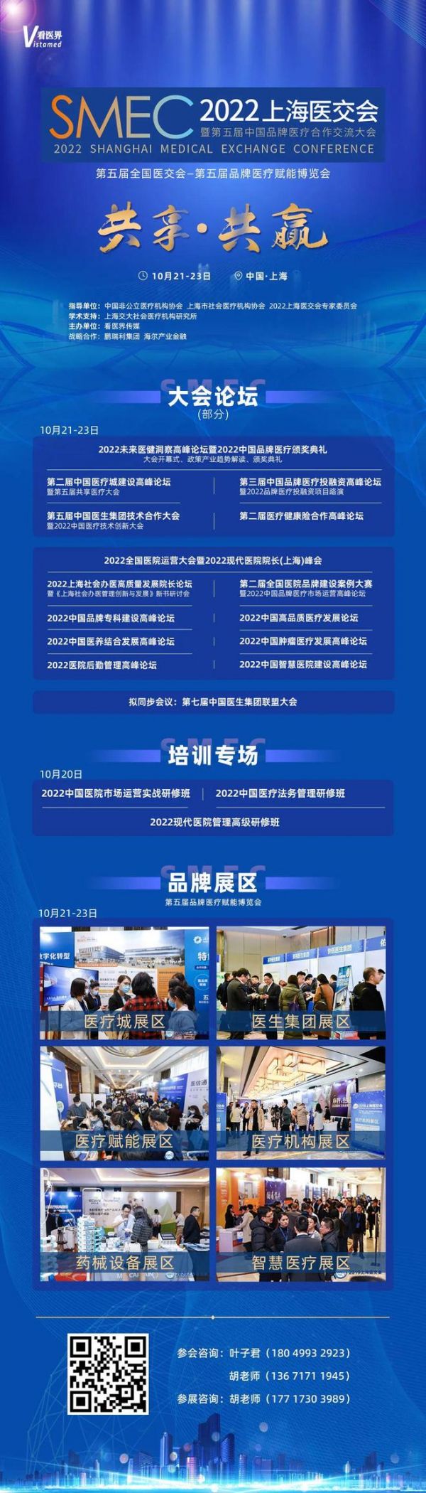 10月21-23日,年度医疗行业盛会2022上海医交会(第五届全国医交会-第五届医疗赋能博览会)将在上海隆重举行,大会同步举办2022全国医院运营大会暨现代医院院长上海峰会,论坛精彩纷呈,并设置品牌医疗城、医疗机构、医生集团、药械设备、智慧医疗、医疗赋能、共享医疗等展区,欢迎报名参会参展,洽谈合作。