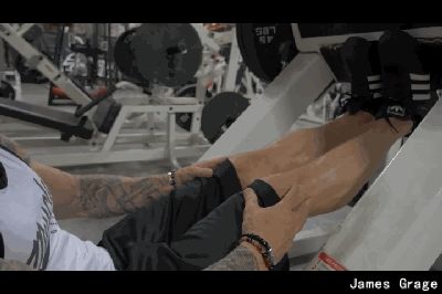 首先仰躺在腿举器械上,然后调整好坐姿,不必使用太大的重量,将脚掌前半部分撑起器械,腿部伸直但不要锁死,通过脚腕的前倾将器械推起,动作要保持平缓,慢起慢落,注意感受顶峰收缩。