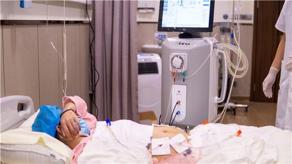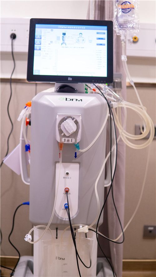 治疗前,肿瘤一科副主任医师黄浩文、李丹副护士长严阵以待。先为刘女士注射2000ml生理盐水,通过B超定位穿刺检查体内液体,达到一定容量后,黄浩文医生在刘女士腹部插入四根冲洗管,将化疗药物在治疗机上自动加热到43℃(正常组织一小时可持续耐受47℃,肿瘤细胞一个小时持续43℃即出现不可逆损害),通过导管进入体腔,再通过另一根导管回到治疗机内再加热,建立一个体外循环系统,在恒温的情况下,对肿瘤细胞实施持续有效地杀伤。