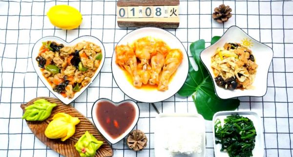 午餐包括豉汁鸡块与蚂蚁上树或虾仁炖粉条(清真)一同上桌,海米西葫芦与蚝油生菜为配菜。主食有大米、包子、花卷和奶香小馒头,汤品为黑米粥,健康又美味。