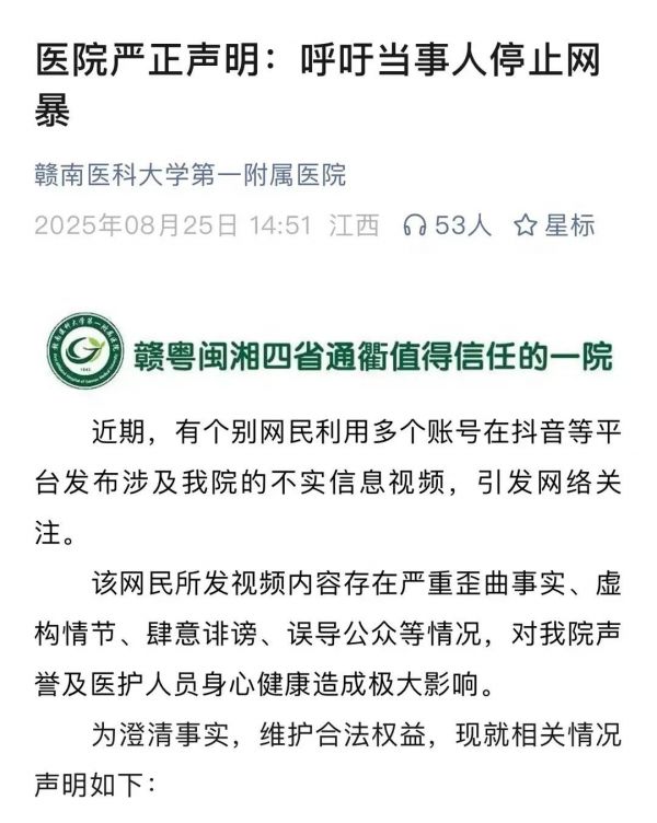 8 月 25 日,赣南医科大学第一附属医院发布严正声明:呼吁停止网暴。