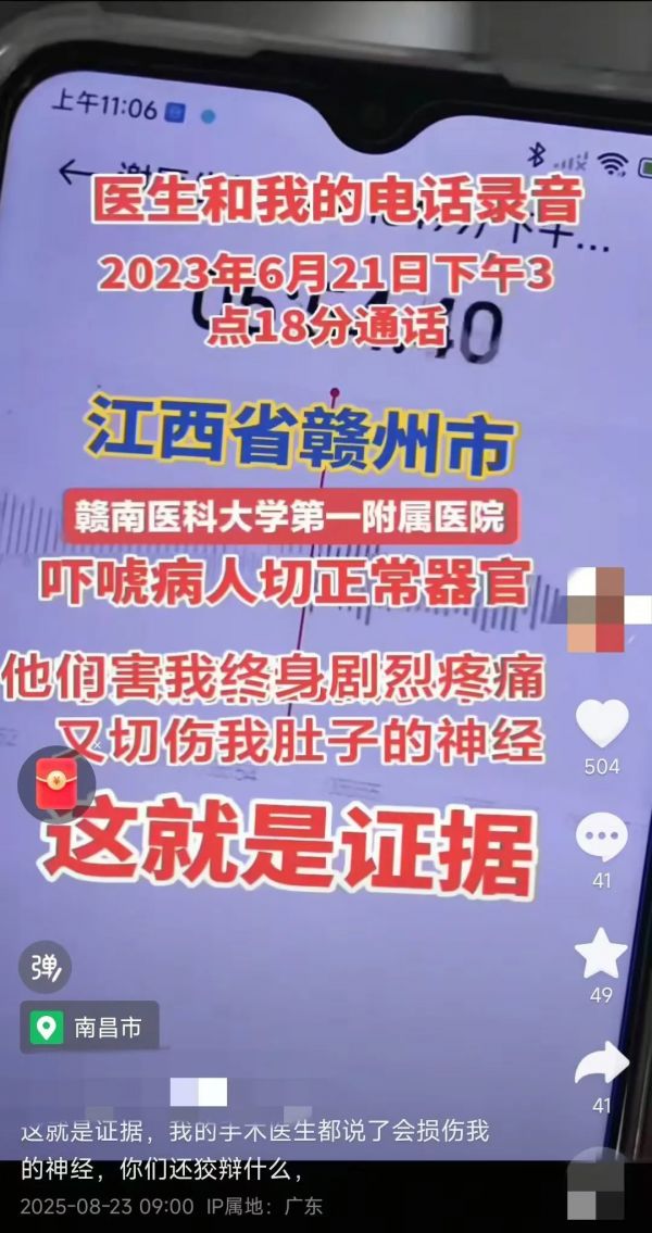 视频中所谓「吓唬病人割掉正常器官」「夸大病情」「司法鉴定结果造假」等内容系恶意捏造。钟某借此向我院索要高额赔偿费用,缺乏事实与法律依据。我院始终坚定维护医院和医护人员的合法权益,拒绝任何形式的非法胁迫。