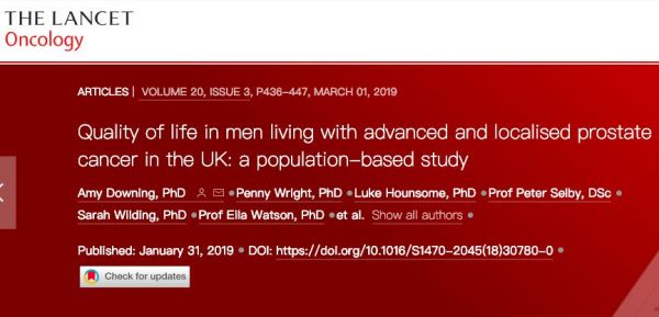 近年来,随着治疗手段的改善,前列腺癌患者治疗后的生存率已得到较大的提高,但是患者的生活质量和功能性转归结果到底如何呢?英国利兹大学数据分析研究所的Adam W Glaser教授及团队便针对这个问题设计了一项基于人群的患者报告的大型研究,研究结果在2019年3月发表于《柳叶刀·肿瘤》(The Lancet Oncology)杂志。该项研究着重分析不同分期的前列腺癌患者的功能性转归及健康相关的生活质量评分,用以指导如何改善和增加医疗系统的服务及支持。