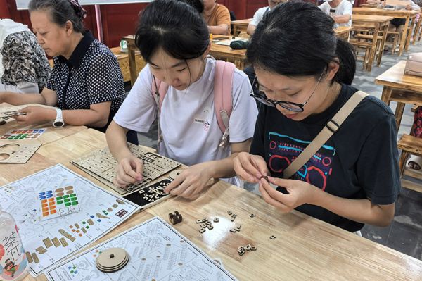 在東配殿劭農堂,這裡不僅是展廳,也是研學課堂。講師為讀者們詳解了中國傳統木構建筑中極具代表性的斗拱結構——它不僅是柱、梁、屋頂間的關鍵承重構件,更集懸挑、裝飾功能於一身,堪稱中國古代建筑技藝的精華。聆聽完老師精彩的講解,大家在老師的帶領下用木質材料拼插出斗拱模型,在實踐中體會榫卯契合的精妙與古人的匠心智慧。