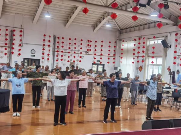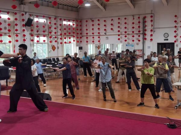 在功法教学环节,韩老师亲自示范指导,带领大家学习古代武将长寿健体养生功法。通过标准的动作演示和细致的要点讲解,帮助学员们掌握实用有效的养生技巧。现场互动频繁,老同志们认真学习,积极练习,展现出浓厚的学习热情。