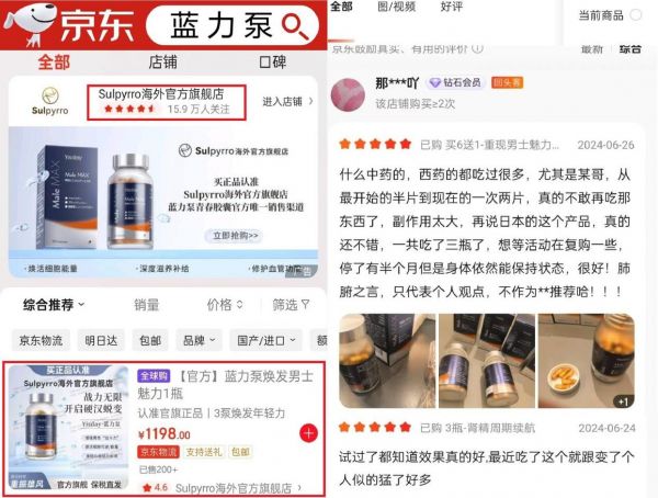 此形势下,“蓝力泵”通过京东(渠道:Sulpyrro海外官方旗舰店)进入国内市场后旋即脱颖而出。据京东后台数据,过去一年该制剂在经济发达城市的加购率同比暴涨68%,更创下时销2000+瓶(其中折算后单价不足千元的6瓶装出货量最为可观)、87.5%复购率等多项类目纪录,成为业界公认的黑马。