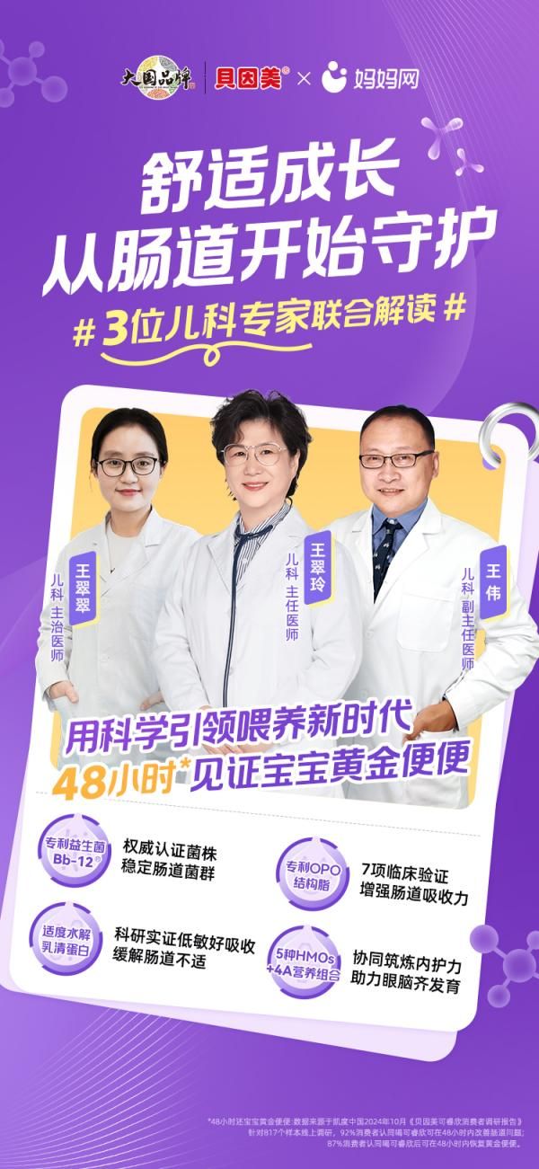 肠道舒适,是宝宝发育的重要起点。贝因美可睿欣联合妈妈网3位儿科专家,围绕宝宝肠道健康、便便表现、营养吸收等问题,推动科学喂养理念进入更多家庭日常。从48小时*黄金便便开始,让每一个宝宝的成长都“肠”舒适,更给力。