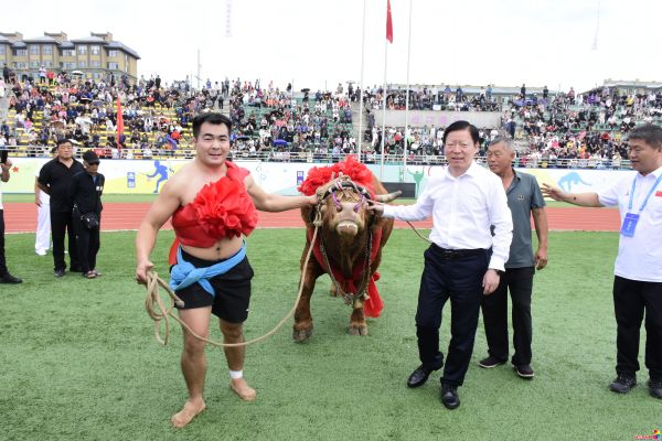 开幕式结束后,民族式摔跤项目87公斤以上级别比赛随即展开,选手俞泽军经过激烈角逐最终夺冠,获得奖品一头黄牛。俞泽军表示,冠军是对自己多年刻苦训练的肯定,也是家乡人民支持鼓励的结果,未来将更加努力训练,为家乡再夺荣誉。
