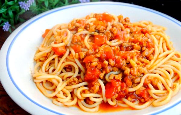 将煮好的面条放入大碗中,加入做好的番茄肉酱,充分拌匀即可享用。这样,一道酱汁浓郁、酸甜开胃的番茄肉酱面就呈现在您眼前了。
