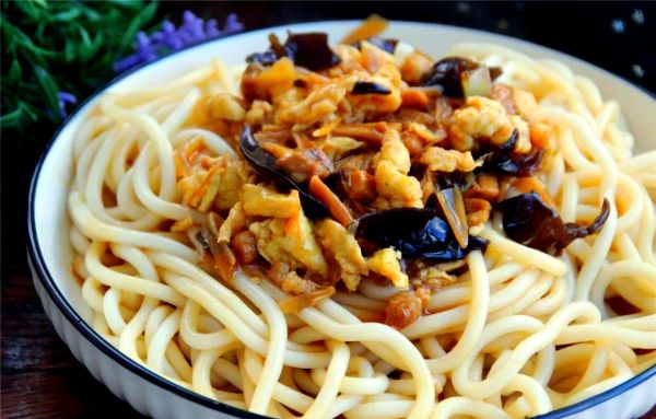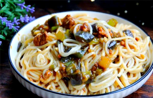 所需材料:切面半斤、猪肉150克、茄子2个、尖椒1个、油盐适量、大蒜3瓣、老抽少许、生抽1汤匙、鸡精1茶匙、花椒粉少许、水淀粉适量。