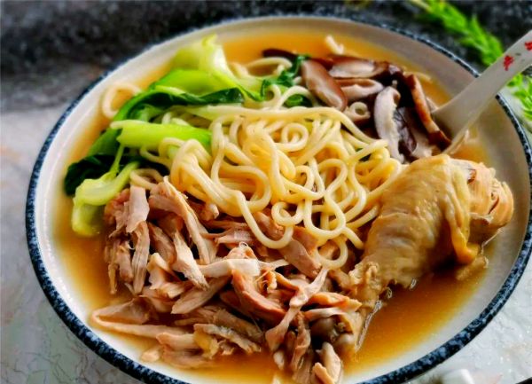 最后,将煮好的面条盛出到碗内,放上切好的鸡腿和鸡丝,再淋上几滴香油增香。这样,一碗香喷喷的早餐鸡腿面就做好了。