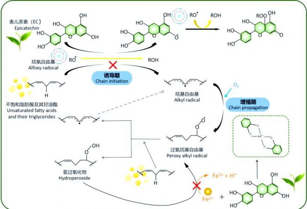 茶多酚能通过向自由基提供电子或氢原子来抑制自由基的活性,进而防止脂肪氧化。