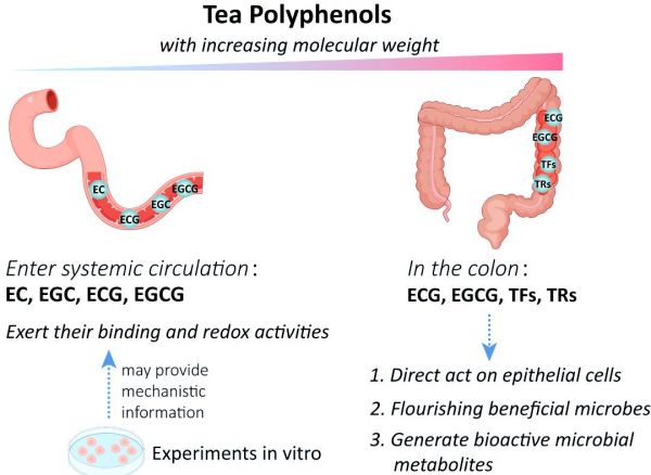 然而,红茶在发酵过程中产生的茶黄素和茶红素,它们的分子量相对较大,分别为868道尔顿和超过2000道尔顿,因此口服后的生物利用度非常低。尽管如此,这些红茶多酚在动物模型中仍然显示出对抗高尿酸血症、肥胖症、肌肉萎缩和认知障碍等疾病的显著活性。