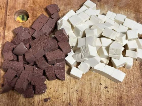 1、鸭血和豆腐切成小块,鸭血开水下锅焯水3分钟左右;