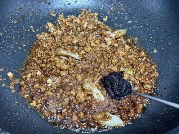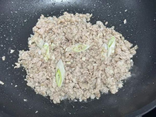 2、锅中热油,下入肉末翻炒至变色,加入葱蒜翻炒出香味;